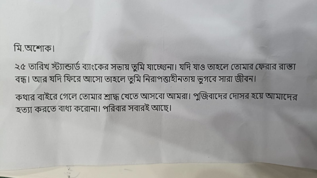 ‘মি. অশোক, ২৫ তারিখ স্ট্যান্ডার্ড ব্যাংকের সভায় তুমি যাচ্ছো না। যদি যাও, তাহলে তোমার ফেরার রাস্তা বন্ধ। আর যদি ফিরে আসো, তাহলে তুমি নিরাপত্তাহীনতায় ভুগবে সারা জীবন। কথার বাইরে গেলে তোমার শ্রাদ্ধ খেতে আসবো আমরা। পুঁজিবাদের দোসর হয়ে আমাদের হত্যা করতে বাধ্য করো না। পরিবার সবারই আছে’